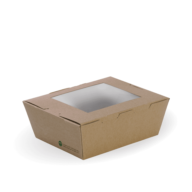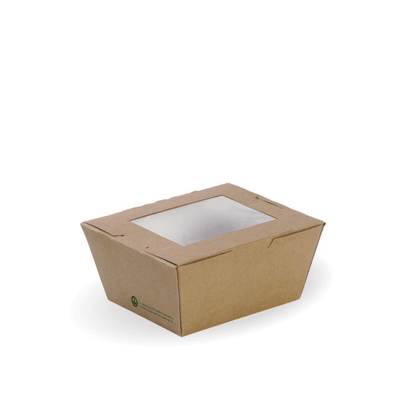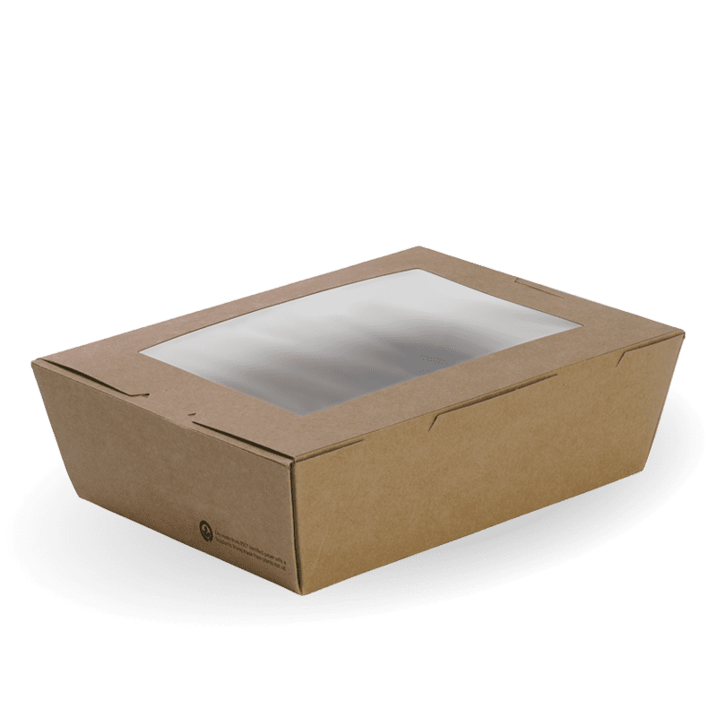 BioBoard lunch boxes are available in a range of sizes and are suitable for a wide variety of food types. Made from FSC® certified paper with a waterproof bioplastic window and lining made from plants, not oil. These containers are commercially compostable.